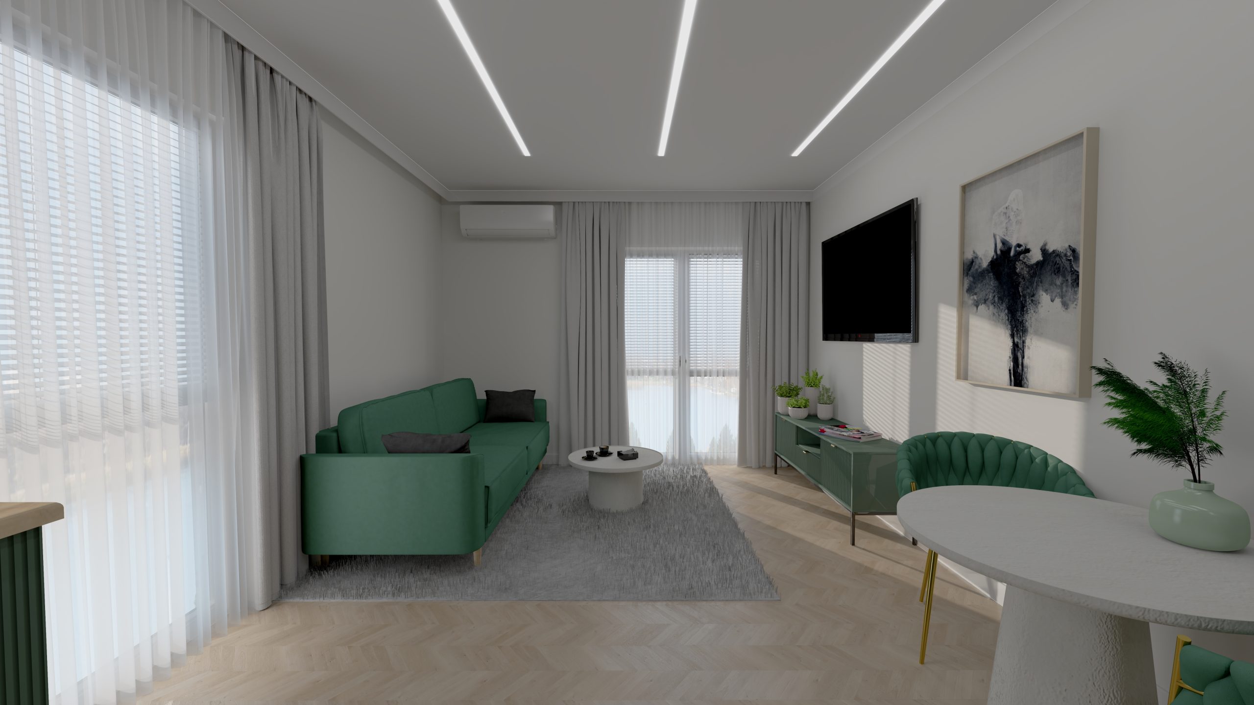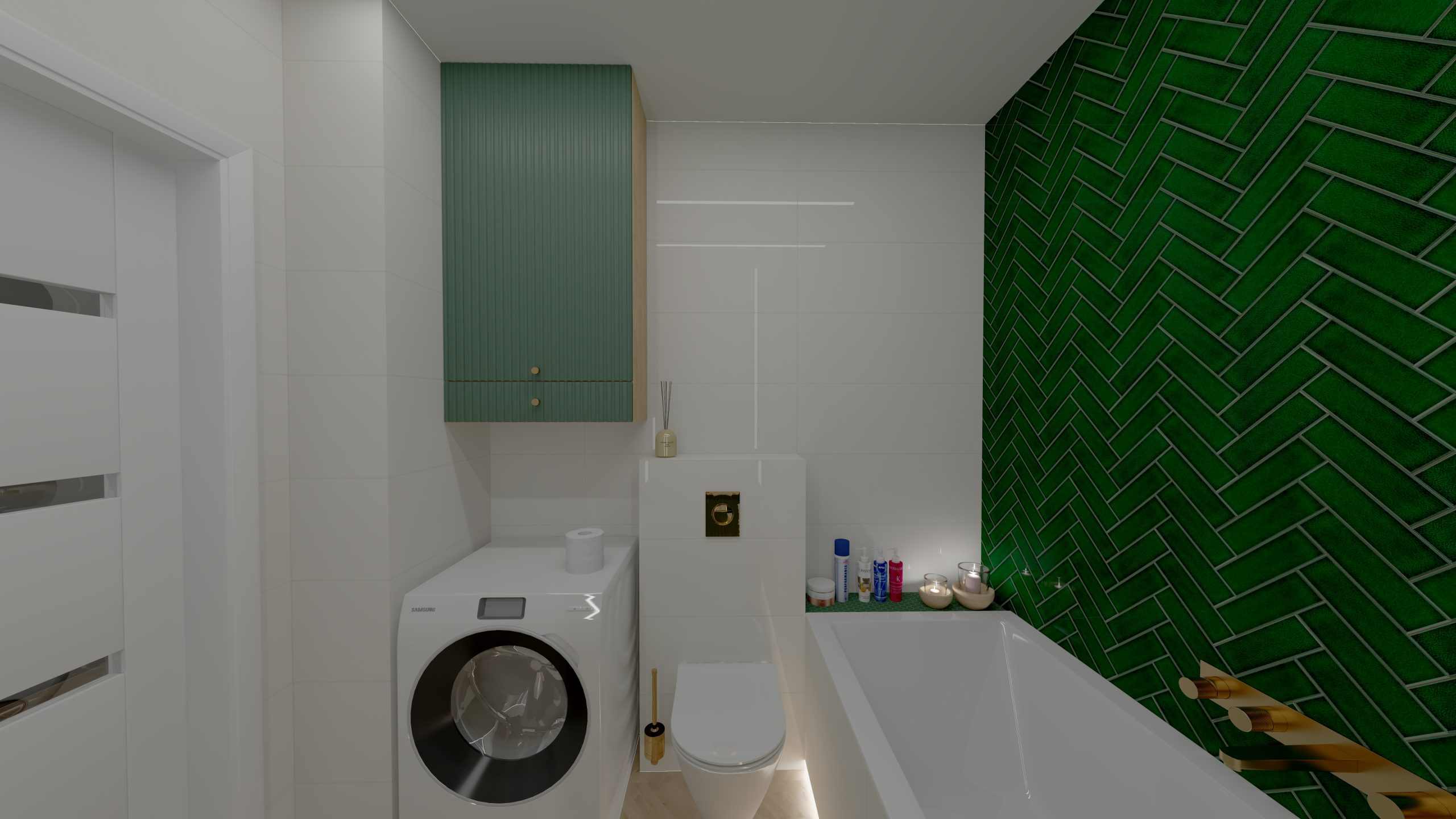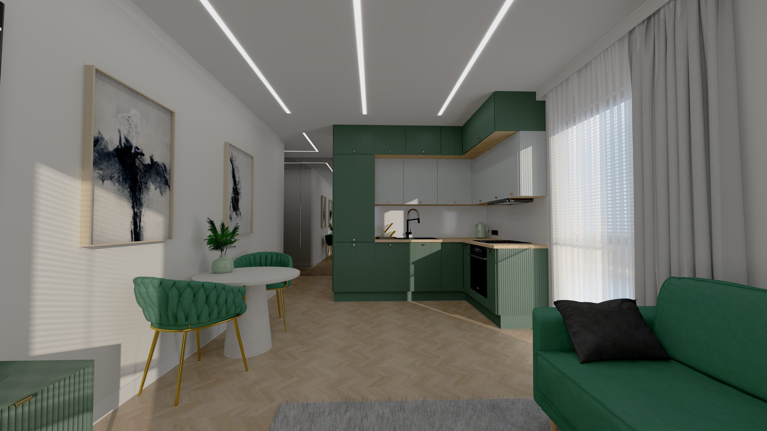 W tym projekcie postawiliśmy na dwa kolory – biel i zieleń. Biel optycznie powiększyła niewielką przestrzeń kawalerki, a uspokajająca zieleń wprowadziła poczucie przytulności. Całość dopełniły proste formy mebli, które podkreśliły minimalistyczny charakter wnętrza.